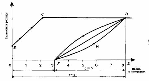 Из рассматриваемого рисунка видно, что из трех вариантов нарастания дохода лучшим является верхний (у него самая большая площадь фигуры FDE ), затем — средний вариант, а худшим — нижний вариант. При этом, как видно из рисунка, у всех вариантов срок окупаемости инвестиций абсолютно одинаков.