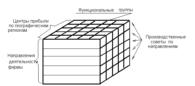 Для предприятий (фирм), действующих на международном рынке, может применяться трехмерная (тензорная) структура управления (Приложение, рис. 6): изделие - регион - функция.