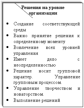 Принятие решения представляет собой сознательный выбор среди имеющихся вариантов или альтернатив направления действий, сокращающих разрыв между настоящим и будущим желаемым состоянием организации. Таким образом, данный процесс включает в себя много различных элементов, но непременно в нем присутствуют такие элементы, как проблемы, цели, альтернативы и решения – как выбор альтернативы. Данный процесс лежит в основе планирования деятельности организации. План – это набор решений по размещению ресурсов и направлению их использования для достижения организационных целей.