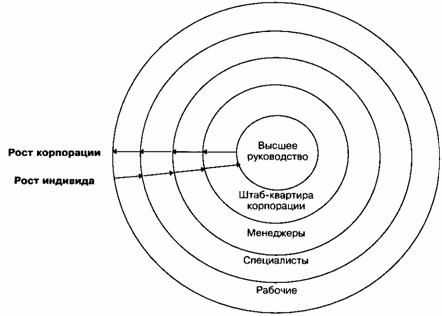 Структура эдхократической организации обычно ассоциируется со схемой концентрической формы (рис. 7). Это не организация, которая видится с началом в одной точке, двигаясь от которой вверх или вниз, вы приходите в конечную точку. В эдхократической организации есть точка отсчета, от которой структура как бы расходится кругами по радиальным направлениям. Круг для такой организации является символом того, что все усилия ее работников ведут к одному, к успеху компании. В ней ценности (в первую очередь - качества ее работников) не ранжируются по уровням. Организации могут иметь разную степень эдхократичности. Тем не менее, совершенно очевидным является то, что это определяется уровнем технологии, качеством работников и подготовкой руководителей.