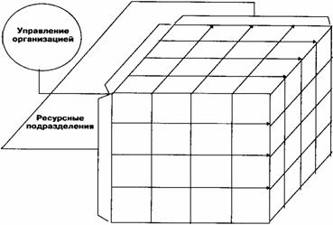В предыдущей главе рассматривалась двумерная модель департаментизации или матричная модель построения организации. Двумя измерениями в ней были ресурсы и результаты, с ориентацией на которые происходит одновременное объединение работ в форме матричных ячеек. Сама матричная организация обычно является комбинацией линейно-функциональной и дивизиональной организаций, как бы складывается из них. Однако при таком подходе за границами матричной организации остаются такие важные переменные, как территория, рынок и потребитель, с ориентацией на которых также могут объединяться работы в организации. При добавлении этого третьего измерения появляются многомерные организации. Впервые этот термин был использован в 1974 г. У. Гоггином при описании структуры корпорации "Доу Корнинг". Многомерная организация может быть изображена, как это показано на рис. 8. Потребительские, рыночные или