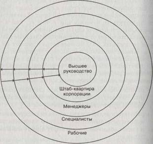 низации есть точка отсчета, от которой структура как бы расходится кругами по радиальным направлениям. Круг для такой организации является символом того, что все усилия ее работников ведут к одному к успеху компании. В ней ценности (в первую очередь — качества ее работников) не ранжируются по уровням. Организации могут иметь разную степень эдхократичности. Тем не менее совершенно очевидным является то, что это определяется уровнем технологии, качеством работников и подготовкой руководителей.