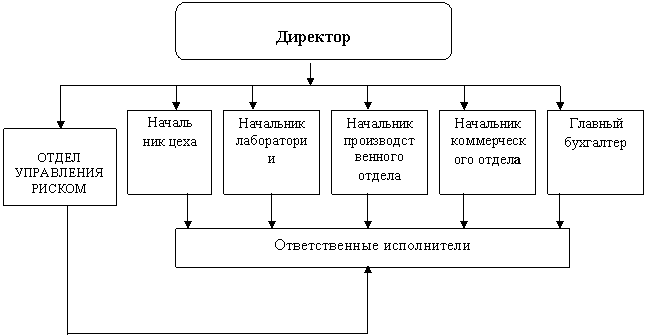 Отдел управления риском является логичным дополнением к традиционно самостоятельным функциональным подсистемам предприятия и располагается на одном управленческом уровне с ними. Отобразим, на рисунке 6, иным образом, но не меняя сути, схематично структуру управления при введении отдела управления риском. Здесь наш отдел координирует деятельность функциональных подразделений предприятия через ответственных исполнителей.