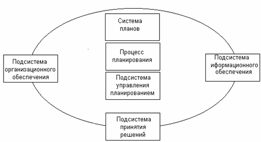 Схематически систему стратегического планирования можно представить следующим образом (рис.3). Она полностью включает систему планов, процесс планирования, подсистему управления планированием и частично — три других элемента: подсистемы организационного и информационного обеспечения, принятие решений.