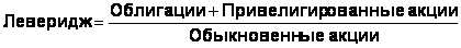 Например, акционерное общество выпустило 10%-ные облигации, на сумму 10 млн. руб., привилегированные акции — 2 млн. руб. с фиксированным дивидендом 40% и обыкновенные акции — 20 млн. руб., то есть акции общества имеют высокий уровень левериджа: 0.6 = (10+2)/20. Прибыль общества составляет 2,2 млн. руб. и распределяется следующим образом. На уплату процентов по облигациям — 1 млн. руб., на дивиденды по привилегированным акциям — 0,8 млн. руб., на дивиденды по обыкновенным акциям — 0,4 млн. руб. Если прибыль снизится до 1,1 млн. руб., то акционерное общество не только «съест» то, что предназначалось на выплату дивидендов по обыкновенным акциям, но и не сможет за счет прибыли выплатить дивиденды по привилегированным акциям. Дальнейшее снижение прибыли приведет к нехватке средств для выплаты процентов по облигациям. В этом заключается опасность акций с высоким уровнем левериджа и проявляется основная слабость тех обществ, у которых имеется большая сумма долга в виде облигаций и привилегированных акций. Осторожные инвесторы обычно избегают покупки таких ценных бумаг.