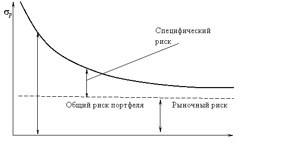 Он показывает, как снижается риска портфеля, если число акций в портфеле увеличивается. Стандартное отклонение для «среднего» портфеля, составленного из одной акции котируемой на Нью-Йоркской фондовой бирже (s1), составляет приблизительно 28%. Средний портфель, составленный из двух случайно выбранных акций, будет иметь меньшее стандартное отклонение – около 25 %. Если число акций в портфеле довести до 10, то риск такого портфеля снижается примерно до 18%. График показывает, что риск портфеля имеет тенденцию к снижению и приближается к некоторому пределу по мере того ,как величина портфеля увеличивается. Портфель состоящий из всех акций, который принято называть рыночным портфелем, должен был бы иметь стандартное отклонение около 15,1%. Таким образом, почти половина риска, присущего отдельной акции, может быть исключена, если акции будут находится в портфеле, состоящем из 40 или более акций. Тем не менее некоторый риск всегда остается, как бы широко не был диверсифицирован портфель.