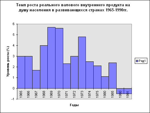 Для многих развивающихся стран характерен не только более низкий уровень дохода на душу населения, чем в развитых государствах, но и более медленный рост ВНП. В 80-х гг. Развивающиеся страны существенно замедлили свой экономический рост, а реальный доход на душу населения в 1990г. сократился на 0,2% и продолжал уменьшаться в 1991г., что видно из следующего рисунка: