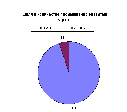 На следующем рисунке показано, что в 21 из 22 промышленно развитых стран (кроме Исландии) на ведущую позицию экспорта приходится менее 25% всех экспортных поступлений. Однако 57% развивающихся стран получают не менее 25% своих экспортных поступлений от одного вида товара.