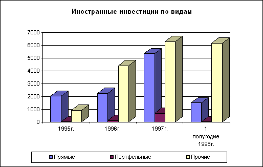В структуре поступившего иностранного капитала наблюдается снижение доли прямых и портфельных инвестиций. Если в 1995г. доля прямых инвестиций составляла 67,7% общего объема иностранных инвестиций, то в I полугодии 1998г.-19,6% Это объясняется стремлением иностранных инвесторов вкладывать капитал в основном в краткосрочные финансовые вложения.