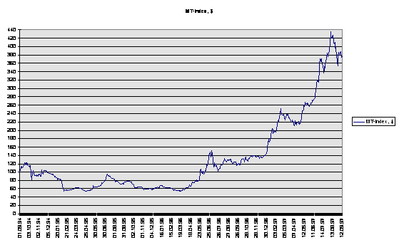 Вплоть до начала 1996 г. российский рынок капиталов находился, если следовать классификации Фабера, в Фазе 1 - несмотря на огромную потенциальную привлекательность рынка в целом, высокие процентные ставки и явную недооценность российских акций, иностранные портфельные инвесторы явно воздерживались от инвестиций на рынке России, опасаясь политической и макроэкономической нестабильности. Однако 1996 г., как уже указывалось в главе IV, принес на рынок большие перемены и российский рынок капиталов по всем позициям перешел в стадию роста. Хорошей иллюстрацией этого роста на примере рынка акций может служить график долларового МТ-индекса (Рис. 4), на котором ясно виден перелом тренда в первой половине 1996 г. Сейчас российский рынок находится, по Фаберу, в Фазе 2 - фазе быстрого роста, сопровождающейся позитивными макроэкономическими и политическими переменами. Резкий рост притока иностранных портфельных инвестиций в российские ценные бумаги подтверждает это. В то же время российский рынок ценных бумаг, очевидно, еще далек от переоценки - так, среднее значение P/E ratio для акций, составляющих МТ-индекс, сейчас равно приблизительно 11,5, что позволяет надеяться на более или менее стабильный рост рынка нынешними темпами на протяжении еще полутора-двух лет. Вместе с тем, анализ с точки зрения теории Фабера указывает на то, что будущее иностранных портфельных инвесторов в России во многом будет зависеть от их участия в конкретных инвестиционных проектах, т.к. рано или поздно рынок будет переоценен, и простое вложение в “индексные” акции уже не будет приносить сегодняшних сверхприбылей.