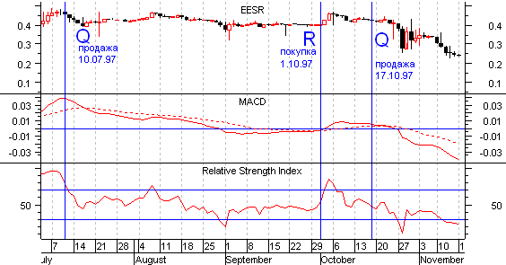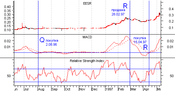 Покупка акций была проведена в момент, когда осциллятор Relative Strength Index находился в середине области. Рынок акций РАО “ЕЭС России” находился в стабильном состоянии, когда цена акций практически не менялась, до 27 декабря 1996 г., после чего цена акций стала медленно увеличиваться. В то же время осциллятор Relative Strength Index указывал на высокую перепроданность, а 12 и 26 дневные средние скользящие - устойчивый рост. Было принято решение не продавать акции.