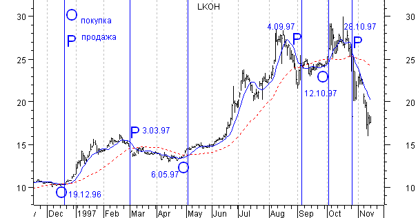 19 декабря 1997 г. на рынке куплено 5000 акций по цене 10,45 $ на общую сумму 52 250 $ в точке пересечения 10 дневной средней скользящей и 40 дневной средней скользящей.