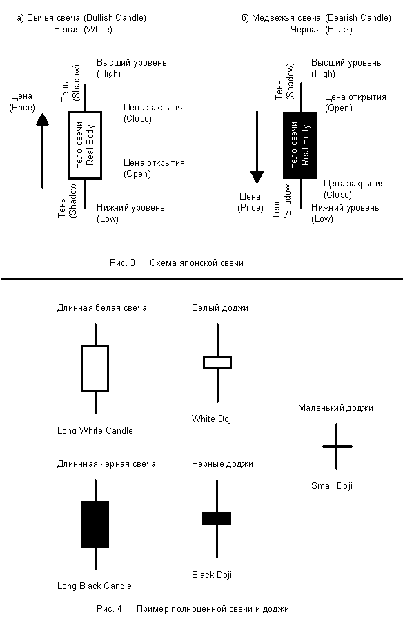 Тело свечи закрашивается по-разному в зависимости от взаимного расположения цен открытия и закрытия. В случае роста цены к моменту закрытия торгов выше цены открытия свеча будет пустая (белая); если цена к концу торгов опустилась ниже цены открытия - свеча будет чёрная. Совпадение цен открытия и закрытия обозначается горизонтальной чертой.