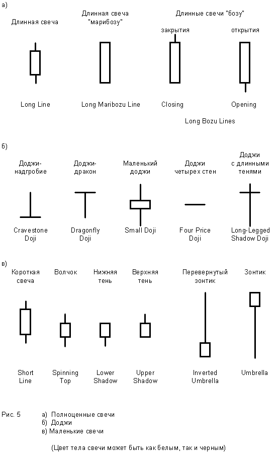 В анализе свечей ключевую роль занимает тело, но не цвет и не тени, которыми часто пренебрегают вообще (например, при проведении на графике линии тренда). По размеру тела можно различить полноценные свечи и доджи (кресты). У последних цены закрытия и открытия близки или равны между собой (рис. 4) [1, с. 50].