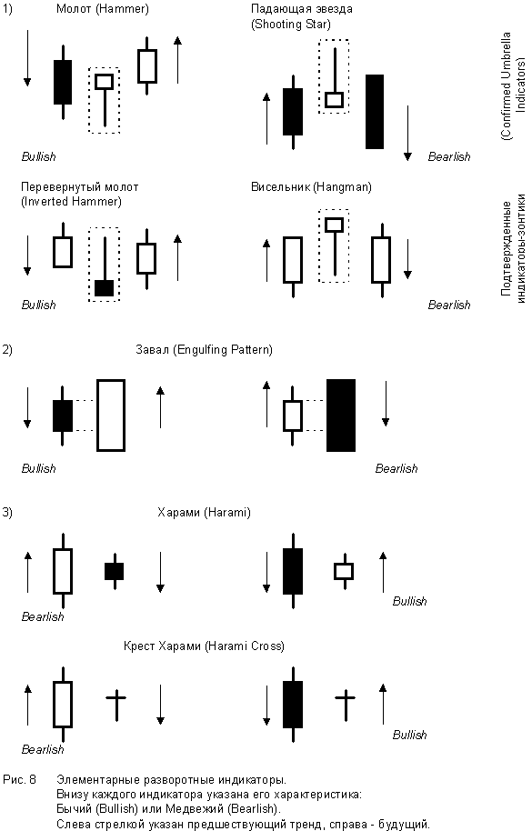 Сигналы о развороте тренда - наиболее сильная часть прогнозирования с помощью японских свечей. Здесь особое значение придаётся доджам - свечам с маленькими телами, или просто маленьким свечам. Существует обширная терминология, где из-за нюансов маленькие свечи и доджи приобретают разные имена. Наиболее важные из них показаны на рис. 5 - кресты и маленькие доджи (у свечи вообще или почти нет тела), зонтик (маленькое тело, длинная нижняя тень), перевёрнутый зонтик (маленькое тело, длинная верхняя тень).