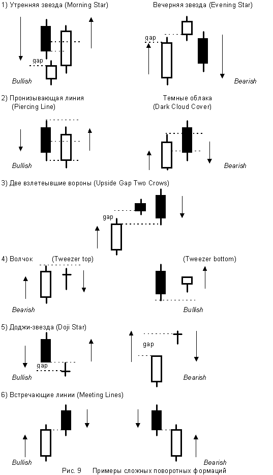 Свечи - наиболее действенный и простой из графических методов. Комбинируя их с методами фильтрации (осцилляторами и скользящими средними), можно получить точные и своевременные сигналы об изменении тренда, и с помощью этого вовремя вступить в сделку на покупку или продажу. По выражению российских дилеров, “гораздо лучше купить понизу и продать поверху, чем наоборот”.