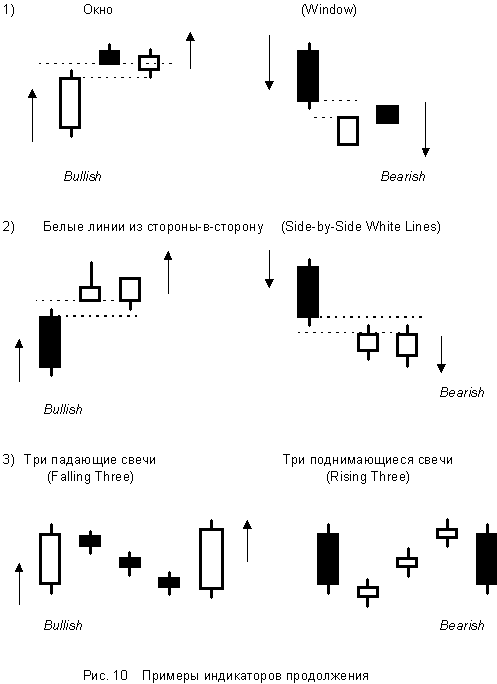 Скачок (gap) или окно (window) при “свечном” техническом анализе указывают на неожиданный резкий отрыв свечи от предшествующей. При этом её тело полностью расположено выше или ниже тела предыдущей свечи (рис. 6).