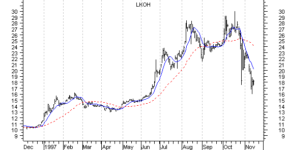Самый простой способ технически проанализировать любой ценовой график - это наложить на график цен скользящее среднее значение, а лучше два скользящих средних значения разных периодов. Скользящее среднее значение рассчитывается усреднением ценовых значений, как правило, цены закрытия, за определенный период времени, при том что период остается всегда одним и тем же. Таким образом, если мы строим 20-дневное скользящее среднее значение мы складываем дневные цены закрытия за последние 20 дней и делим их на двадцать (усредняем) и на следующий день мы опять делаем то же самое, но уже учитывая новую дневную цену закрытия и отбрасывая цену закрытия, которая была зафиксирована 21 день назад. Динамика строящейся кривой каждый день как бы “проскальзывает” во времени на один день вперед.