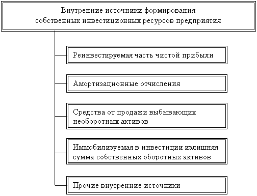 Среди представленных на рисунке видов внутренних источников формирования инвестиционных ресурсов предприятия главенствующая роль принадлежит реинвестируемой части чистой прибыли.