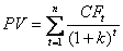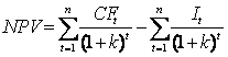 Общая накопленная величина дисконтированных доходов (CF) и чистая приведённая стоимость рассчитываются по формулам: