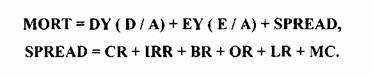 Ставка процента по таким активам, как ипотечный кредит, может быть определена как сумма средневзвешенных затрат на капитал и ожидаемых затрат в связи с финансированием, обслуживанием и инвестированием, определяемых как величина дохода по ипотечным кредитам, достаточного для покрытия предельной величины стоимости банковских фондов, эксплуатационных расходов и ожидаемых потерь. Средневзвешенные затраты на капитал представляют собой величину необходимого для держателей долговых обязательств банка (вкладчиков) и акционеров дохода, который представляет собой процент прибыли по ипотечным кредитам за весь срок. Приведенная ниже формула включает различные базовые ставки и отдельные надбавки к ним для держателей долговых обязательств и акций, скорректированные с учетом риска возможных потерь, такие как: ставка по заемным средствам (надбавка к базовой ставке для вкладчиков) (DY), отношение стоимости заемных средств к стоимости активов (D/A), ставка на акционерный капитал (надбавка к базовой ставке для акционеров или надбавка на акционерный доход) (EY), отношение стоимости акционерного капитала к стоимости банковских фондов (Е / А), ожидаемые надбавки на расходы и риск (SPREAD) - надбавка за кредитный риск (CR), надбавка за риск процентной ставки (IRR), надбавка за риск изменения условий мобилизации фондов (BR), надбавка за риск альтернативного выбора (OR), надбавка за риск ликвидности (LR), предельные административные расходы (МС). Ставка процента по ипотечному кредиту (MORT) может быть представлена следующим образом [36, с.111]: