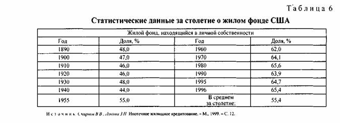 Вместе с тем приведенные в табл.6 данные свидетельствуют о том, что ипотечное жилищное кредитование в США развивалось в течение очень длительного времени, поэтому и класс заемщиков ипотечных кредитов формировался исходя из приоритета в отношении института собственников в жилищной сфере, опирающегося на столетние традиции.