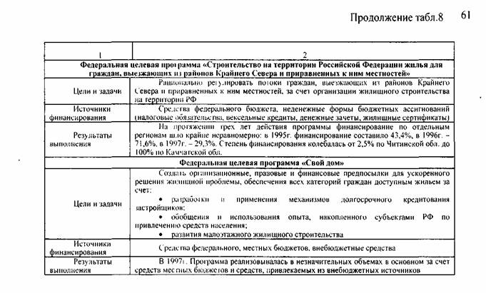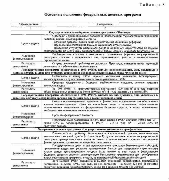 Изменение соотношения источников финансирования не только не уменьшило остроту жилищной проблемы, но и привело к дальнейшему ее возрастанию. В частности, еще более очевидной стала проблема недооценки значимости социальной направленности жилищной реформы. Для ее решения понадобилась разработка дополнительных мер государственной поддержки определенных социальных групп населения, прежде всего малоимущих граждан, молодых и многодетных семей, а также военнослужащих, граждан, уволенных с военной службы в запас или отставку, лиц, проработавших длительное время в районах Крайнего Севера и приравненных к ним местностях, вынужденных переселенцев, граждан, пострадавших в результате аварий и стихийных бедствий. На решение этих задач и был направлен ряд разработанных и утвержденных федеральных целевых программ. Ход и итоги их реализации представлены в табл.8 [116, с. 14].