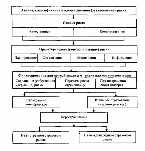 В последней четверти века на международном страховом рынке наблюдается рост убыточности большинства видов страховых операций. Причиной служат частые катастрофы природного и техногенного характера, от которых страдают не только страховые компании, но и экономика в целом. Для снижения значимости данных негативных явлений за рубежом была создана система «управления риском» (risk management), включающая четыре последовательных направления деятельности (рис.2.3.1.).