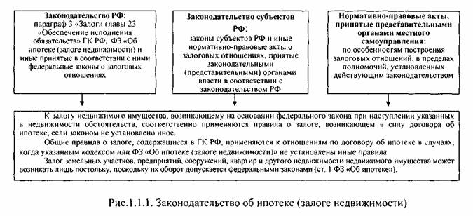 Нормы, регулирующие ипотеку, содержатся не только в ФЗ «Об ипотеке», но и в ГК РФ. Согласно п.2 ст.334 ГК РФ общие правила Кодекса о залоге применяются к ипотеке лишь в случаях, когда самим ГК РФ или законом «Об ипотеке» не установлены иные правила. Таким образом, несмотря на то, что ГК РФ содержит ряд специальных норм об ипотеке (п. 2-3 ст.339, п. 2-5 ст.340, п.1 ст.349 и др.), основной массив норм, регулирующих ипотеку, содержится в ФЗ «Об ипотеке».