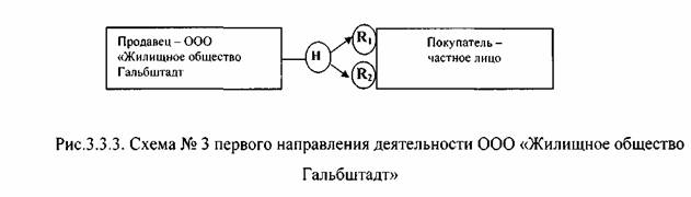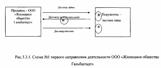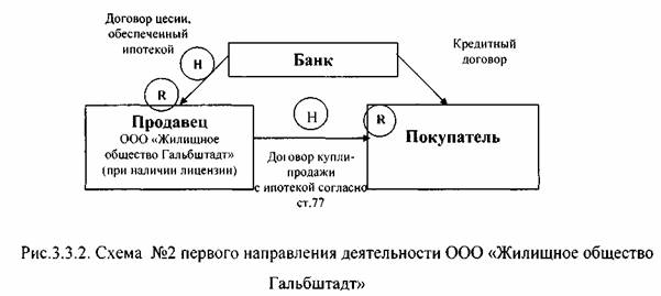 Вместе с тем схема № 1 имеет очевидные объективно-правовые недостатки. Договор ипотеки можно заключить только после возникновения права собственности на жилой дом (п.1 ст.6 ФЗ «Об ипотеке» и абзац 4 п.2 ст. 13 федерального закона № 122-ФЗ от 21 июля 1997г. «О государственной регистрации прав на недвижимое имущество и сделок с ним»). То есть, наблюдается разрыв между моментом заключения и государственной регистрации договора купли-продажи и моментом совершения сделки залога. После оформления права собственности на жилой дом покупатель может всячески уклоняться от заключения договора залога, несмотря на ранее принятые обязательства. Конечно можно понудить покупателя к заключению договора ипотеки в судебном порядке (например, предусмотреть это предварительным договором). Однако заключение такого договора потребует дополнительных расходов на его нотариальное удостоверение. Кроме того, такая схема предполагает, что на заключительном этапе сделки инициативная роль будет принадлежать ООО «Жилищное общество Гальбштадт» при явной незаинтересованности покупателя. Это, в свою очередь, увеличивает объем работы ООО «Жилищное общество Гальбштадт», что представляется нецелесообразным.