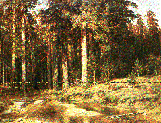 На этой знаменитой картине И. И. Шишкина с очевидностью просматриваются мотивы золотого сечения. Ярко освещенная солнцем сосна (стоящая на первом плане) делит длину картины по золотому сечению. Справа от сосны - освещенный солнцем пригорок. Он делит по золотому сечению правую часть картины по горизонтали. Слева от главной сосны находится множество сосен - при желании можно с успехом продолжить деление картины по золотому сечению и дальше.