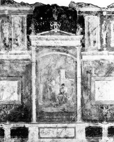 «С перенесением акцента на интерьер и появлением парадных комнат в римских домах и виллах на основе греческой традиции разрабатывается система высокохудожественных стенных росписей. С традициями эллинистических фресок тесно связан первый римский стиль живописи – так называемый помпейский, изученный по фрескам обнаруженных в раскопанных археологами провинциальных Помпеях и в других городах Кампании (II-I вв. до н. э.). Помпейские росписи уцелели благодаря тому, что во время сильного извержения вулкана Везувий (79 г. н. э.) толстый слой вулканического пепла засыпал Помпеи вместе с домами и виллами, а в некоторых случаях даже и с жителями» [3, с. 245].