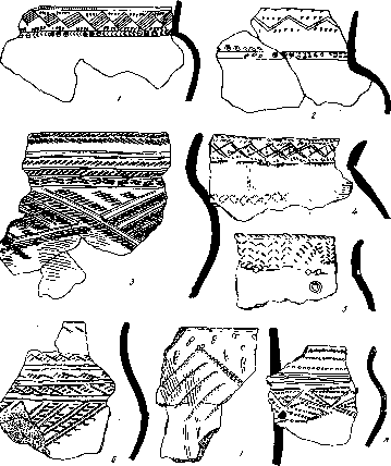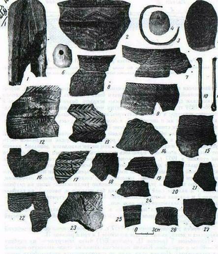 1-литейная форма; 2-сосуд из погребения 3; 3-медный браслет из погребения 1; 4,6-подвески из раковин погребения 7; 7-9, 12-27-керамика из стоянки Ахметово I; 5-пест со стоянки Ахметово II; 10,11-подвески из кости со стоянки им. М.И. Касьянова