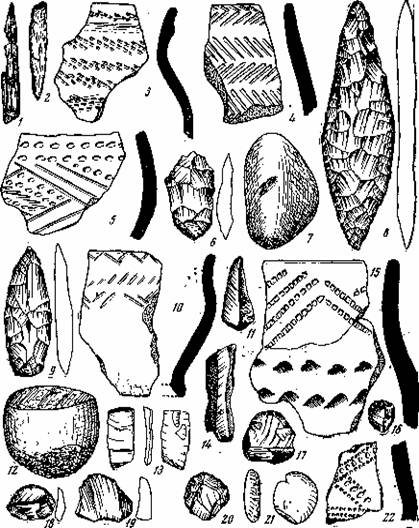 1, 2 – костяные проколки и обломок наконечника стрелы; 3–5 –керамика; 6-9, 14,18, 19-каменные и кремневые орудия со стоянки Ахметово I; 10,15, 22-керамика; 12-отбойник; 21-глиняный штамп со стоянки Ахметово II; 11, 13, 16, 17, 20-кремневые орудия со стоянки им. М.И. Касьянова (2/3 н.в.)