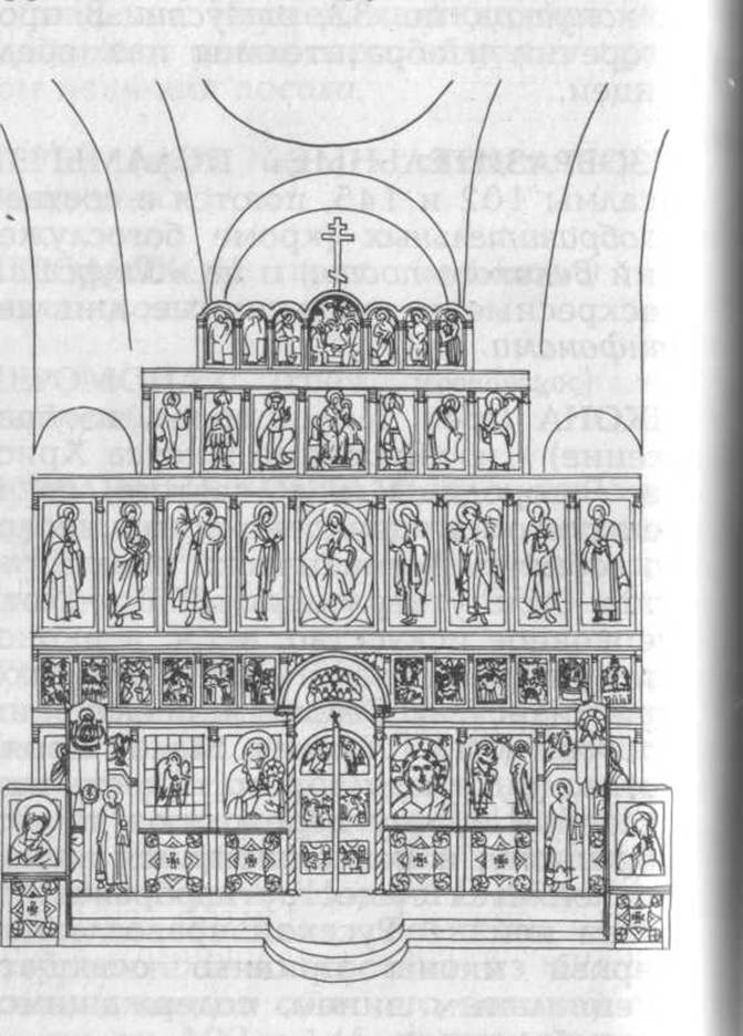 ИКОНОСТАС (греч. eixovoordaiov) - перегородка, разделяющая алтарь и среднюю часть храма. Состоит из икон, расположенных ярусами. Число ярусов бывает от трех до пяти. В середине нижнего яруса находятся врата царские, справа от врат расположены икона Иисуса Христа и икона святого или праздника, которым посвящен храм; слева от врат расположены икона Богородицы и любая другая. За иконами нижнего ряда с обеих сторон (в небольших храмах и приделах только с одной) расположены двери дьяконские. Над царскими вратами помещается икона Тайной Вечери. Второй ярус снизу содержит иконы двунадесятых праздников. Третий ярус содержит иконы деисисного чина. Четвертый - икону Богородицы с Младенцем Христом и иконы предстоящих пророков. Верхний, пятый и рус - икону Троицы и иконы предстоящих ветхозаветных праведников и праотцев (Авраама, Исаака, Иакова и др.). Завершается иконостас распятием.
