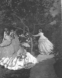 У Глейра Моне познакомился с Ренуаром, Сислеем, Базилем. Здесь выработались основы их объединения. В январе 1865 Моне работает в мастерской Базиля, где он встретил Писарро и Сезанна. Позже Моне и Писарро отправились в Марлотт, где они встретились с Ренуаром и Сислеем. Художники удалось написать многочисленные виды леса Фонтенбло. Камилла Донсье, позировавшая для Моне в это время, через четыре года стала его женой. Позже Моне написал большую картину в сияющей гамме, на светлом фоне - здесь изображены несколько девушек в его саду, единственной моделью для которых послужила Камилла. («Женщины в саду» Париж, Мюзэ Д’Орсэ).