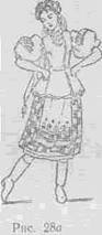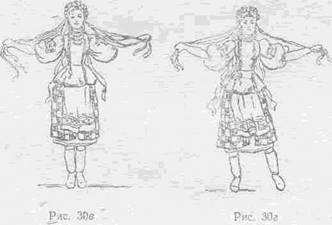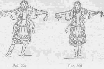 На «затакт и» — раскрыть руки широко в стороны, взяв в каждую руку по нескольку лент от венка. Поднять правую ногу невысоко вправо, левая нога немного согнута в колене (рис.ЗОа)