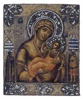 Оклад иконы является типичным образцом работы ювелирных мастерских Московского Кремля конца XVII века. Эмаль по сканному орнаменту применялась русскими мастерами начиная с XVI века. Сканные работы с эмалью никогда не полировались, так как эмаль помещалась, как правило, ниже сканного орнамента. Белая эмаль, положенная на венце Богородицы в колечках скани, рельефно выступает, имитируя жемчужины.