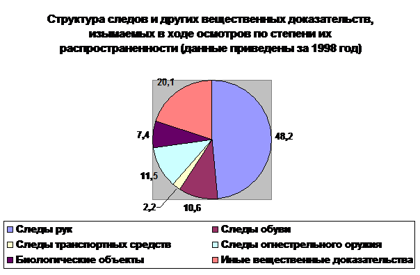 Исходя из исследования данных отчета ЭКО ОВД города Бузулука и Бузулукского района можно сделать вывод о том, что с каждым годом растет результативность проводимых осмотров мест происшествий. Если в 1997 году назначенные по изъятым следам в ходе осмотров экспертизы и исследования способствовали расследованию преступлений в 504 случаях, то 1998 году уже в 758 случаях, т.е. эффективность проводимых осмотров увеличилась в полтора раза. При этом в большинстве случаев в ходе осмотров изымаются следы рук, о чем свидетельствует следующая диаграмма: