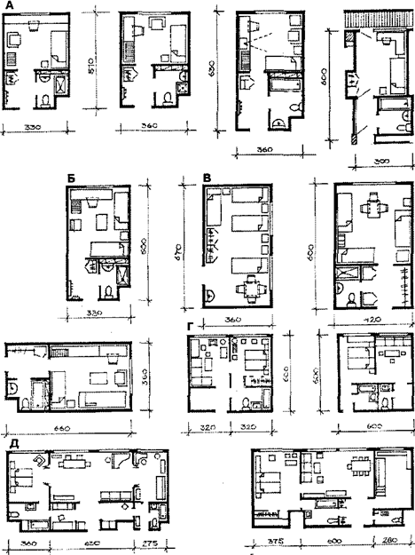 Рис. 11. Планировочная организация гостиничных номеров: А - одноместный, Б - двухместный, В - трёх-четырёхместный, Г - двухкомнатный люкс, Д - номера-апартаменты