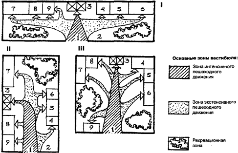 В вестибюлях предусматриваются следующие основные зоны: интенсивного пешеходного движения, экстенсивного пешеходного движения, рекреационная и вспомогательная.