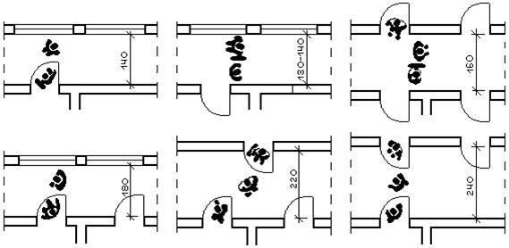 Коридоры, как и вестибюль, составляют первоначальное представление о гостинице. Ширина коридора рассчитывается так, чтобы в нём легко могли разминуться два человека с чемоданами в руках. Отсюда требуемая ширина одностороннего коридора не мене 1,3–1,4 м, а двустороннего – 1,6–2,0 м (если двери открываются внутрь номера). Если же двери открываются в коридор, ширина его соответственно увеличивается (Рис.6)