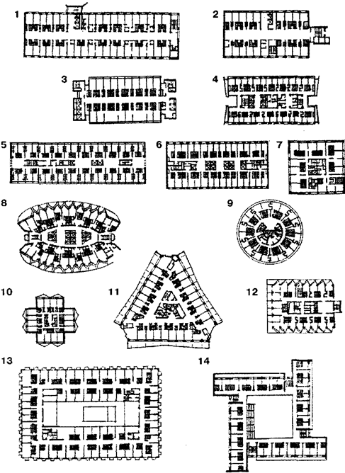 Рис. 7. Форма плана жилых этажей гостиниц: прямоугольная (1-6), компактная (7-12), атриумная (13-14). 1 - "Мир", Москва; 2 - мотель на Минском шоссе, Москва; 3 - "Радиссон-Саут", Миннеаполис, США; 4 - "Виру", Таллин; 5 - "Спутник", Москва; 6 - "Штадт-Берлин", Берлин; 7 - "Тур-отель", Линц, Австрия; 8 - "Казахстан", Алма-Ата; 9 - "Бдапешт", Будапешт, Венгрия; 10 - "Кубань", "Солнечный Берег", Болгария; 11 - "Травелледж-Тюлламари", Мельбурн, Австралия; 12 - "Киев", Киев; 13 - мотель "Шератон", Сиэтл, США; 14 - мотель в Олимпии, Греция.