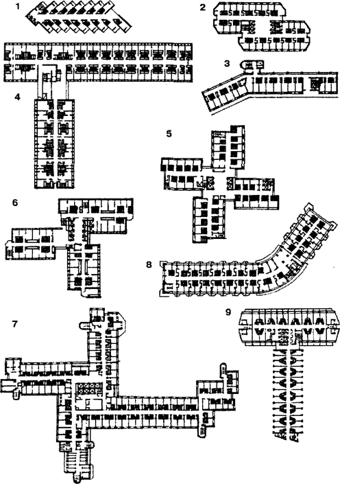 Рис. 8. Усложнённая форма плана жилых этажей гостиниц: 1 - "Кашакра", Албена, Болгария; 2 - "Русский памятник", София, Болгария; 3 - "Колэраши", Румыния; 4 - "Мелия Костилла", Испания; 5 - "Познань", Познань, Польша; 6 - "Молодёжная", Москва; 7 - "Тауэр-отель", Лондон; 8 - "Алма-Ата", Алма-Ата, Казахстан; 9 - "Роял-Гарден", Лондон.