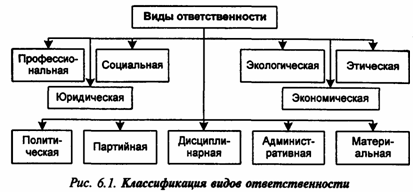 Многообразие сфер деятельности компаний сформировало следующий типовой набор видов ответственности: профессиональная, юридическая (в том числе уголовная), социальная, экологическая, экономическая, этическая, политическая, партийная, дисциплинарная, административная, материальная (рис. 6.1).