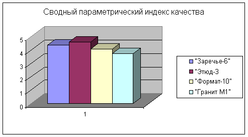 Учитывая бальные оценки и вес параметров каждой технической характеристики, получаем сводный параметрический индекс качества (индекс технических параметров). Значит, по техническим параметрам более конкурентоспособной является стенка ОАО “Стайлинг” – “Этюд-3” (4,55), от нее незначительно отстала стенка ОАО “СМК” – “Заречье-6” (4,35), “ВОГ” – “Формат-10” заняла третье место (4,05) и на последней позиции находится ООО “ШМП” – “Гранит-М1”.