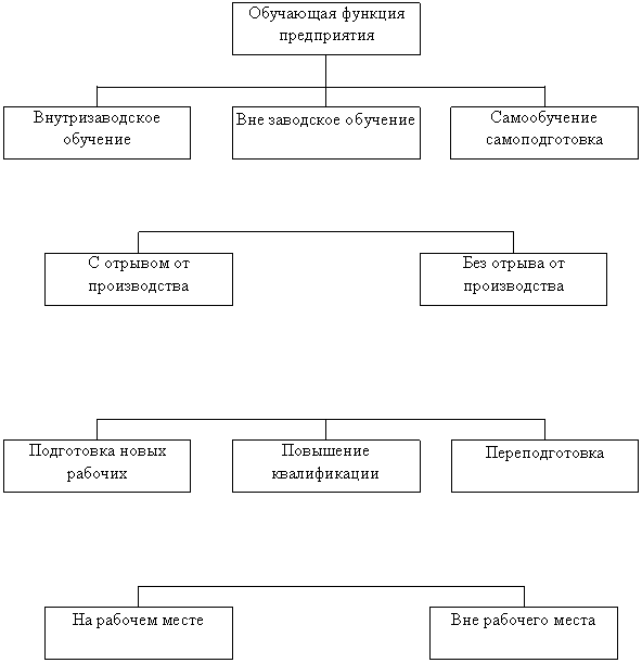 Обучающая деятельность предприятия представлена достаточно разнообразными ее видами (рис. 1.1.). Прежде всего, обращает на себя внимание, что обучение может быть организовано непосредственно на предприятии собственными силами. Во вне заводском обучение роль предприятия сводится к определению требований не только к количеству, но и к направленности обучения, закрепленных в соответствующих договорах на подготовку. Само обучение осуществляется в специально обучающих центрах, а также в системе высшего и среднего специального образования.