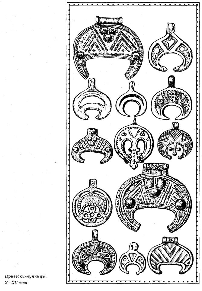 Если для «солнечных» круглых привесок употреблялись в основном жёлтые сплавы, то на привески-«лунницы» чаще шли белые, в цвет лунного света, — серебро или серебро с оловом, а бронза — лишь изредка. Оно и понятно, ведь в лунницах, как пишут учёные, отразился древний культ Луны, распространённый не только у славян, но и у других древних народов Европы и Азии. В славянских погребениях лунницы появляются с X века. Обычно их носили по нескольку штук в составе ожерелья, а то вдевали в уши, как серьги. Богатые, знатные женщины носили лунницы из чистого серебра; нередко они отмечены тончайшей ювелирной работой, их украшает мельчайшая зернь и филигрань. Не случайно их находят в окрестностях крупных городов Древней Руси, которые вырастали вдоль торговых путей.