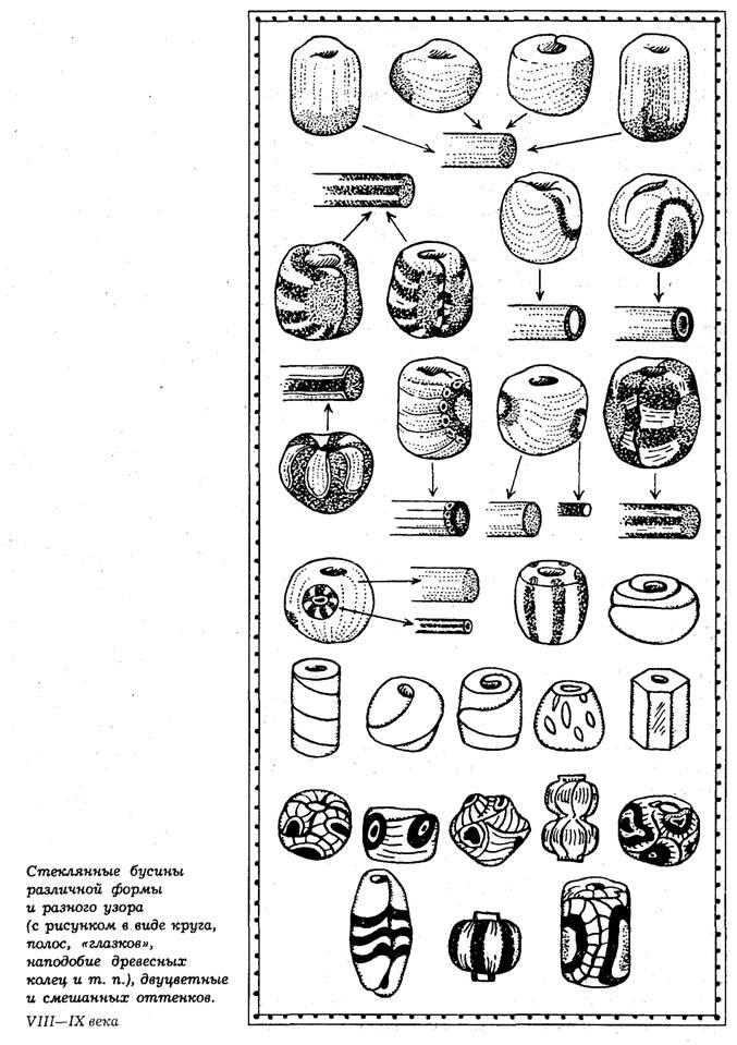 Одни бусины попали на волховские берега из Средней Азии, другие с Северного Кавказа, третьи — из Сирии, четвёртые — вовсе с Африканского континента, из египетских мастерских. Самое интересное, что везли их сюда не восточным путём, через Русь, а, наоборот, по водным магистралям Западной Европы — через земли западных (Словакия, Моравия, Чехия) и балтийских славян, владевших выходами в море. Образцы таких бус найдены и в Скандинавских странах, в торговых центрах, известных в те времена по всему балтийскому «Средиземноморью»: в городах Хедебю и Бирке, на острове Готланд, Сюда везли бусы, продавали их друг другу и местному населению купцы — славянские, скандинавские и прочие. (Кстати, нельзя исключать, что бусы порой служили не только товаром, — но об этом чуть позже.) А начиная с IX века в этих городах кроме привозных бус находят и явно сделанные на месте .