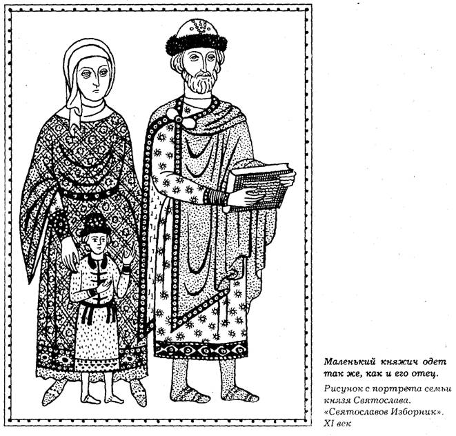 Так одевались дети славянского простонародья. У высших социальных слоев обычаи были несколько иными. И дело даже не в том, что боярские дети были наряжены богаче крестьянских. На миниатюре из книги XI века маленький княжич одет совершенно как взрослый, разве что без некоторых знаков княжеского достоинства. Следует предположить, что над «княжатами» обряды инициации совершались значительно раньше, чем над детьми простого народа. Ведь в случае гибели отца сыну, невзирая на малолетство, предстояло занять княжеский стол. А что если художник, работая над парадным портретом семьи великого князя, решил изобразить именно будущего правителя, а не просто ребёнка и не Счёл возможным рисовать его в одежде непосвящённого? Трудно сказать.